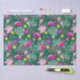 Super funny tropical pickleball party with pink flamingos, drinks and tropical foliage.