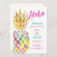 Tropical Pineapple Baby Shower Invitation. Aloha. Girl Baby Shower. Tropical Party. Summer Hawaiian Laua Leaves . Gold and Colourful Pineapple. For further customization, please click the "Customize it" button and use our design tool to modify this template.