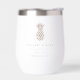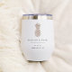 These elegant minimalist wine tumblers make great bridal party gifts or destination wedding favours for your summer or tropical wedding. Clean minimal design features your names, wedding date, and location in classic black serif lettering. A pineapple illustration in neutral sandy tan beige completes the design.