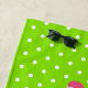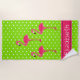 This cute beach towel features bright pink flamingos on a background of tropical green and white polka dots. Personalize the matching pink and white stripe with your choice of name or special text.