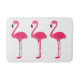 This fun bath mat features three cute pink flamingos on a solid white background.