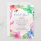 Modern ocean beach destination Hawaiian style bridal shower party invitation template featuring a colourful hibiscus flowers wreath with tropical leaves, a starfish, a pink flamingo bird and blue script over a watercolor wash blush pink background. ++++++++++ The invitation is suitable for summer aloha, seaside, ocean, beach, destination seasonal by the sea wedding bridal parties.