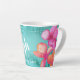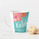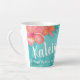 Personalized coffee mug with tropical teal background with bold pink and orange plumeria flowers overlaid. Easily customize name and message for your own personal touch. Perfect for a personalized Mother's Day coffee mug. Versatile for coastal themes, beach wedding gifts, and coral and turquoise colour themes. Easily add your name and monogram, or Quote / Saying for a personal touch.