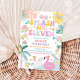 Make a splash with this vibrant tropical pool party birthday invitation, perfect for summer celebrations! Featuring playful illustrations of flamingo and swan floats, pineapples, watermelon slices, sunglasses, and tropical flowers, it sets the tone for a fun-filled day. This cheerful design is ideal for kids birthdays, pool parties, or summer gatherings, bringing a colourful and festive vibe to your event. Personalize easily with party details and impress guests with a stylish, eye-catching invite.