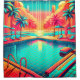 Immerse yourself in the vibrant charm of this stunning artwork featuring a tropical pool scene with a cityscape backdrop. The clear blue water of the pool is surrounded by a tiled deck and multiple lounge chairs, creating a serene and inviting atmosphere. Palm trees frame the scene, adding to the tropical ambiance. In the background, a cityscape with tall buildings is illuminated by a sky transitioning from warm orange to cool blue hues, suggesting either sunrise or sunset. Vertical streaks of light descend from the sky, enhancing the surreal and retro-futuristic feel of the design. Perfect for adding a touch of tropical elegance and colour to any space.