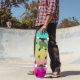 This tropical design features pineapple, flamingo, and palm tree silhouettes on a gradient background of blue, pink, and yellow.
