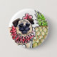 A pug on vacation enjoys a tropical hibiscus lei and pineapple.