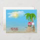 Christmas sand snowman with sunglasses and striped cap in beach sand with holiday lights on palm tree.