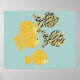 Mosaic, graphic drawing, with group, of striped, and stencil-patterned, fish-displayed in bright, colours of, orange, red, yellow, gold, taupe, brown, black, white, upon, robin's egg-blue, background.