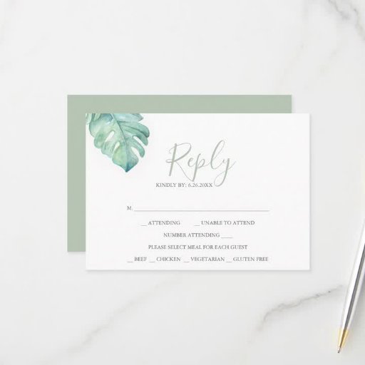 Your name is highlighted in a stylish handwritten script, while the event details are set in a classic charcoal serif font on a crisp white background. The top border showcases my original watercolor artwork, and the back of the card features a coordinating tropical sage green.