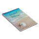 Spiral bound journal with beach scene and two places for text on the front. A realistic sand dollar and starfish appear to be sitting on the beach sand. Dark blue script text for title with a smaller line of printed text beneath. Tropical blue ocean water and little waves coming ashore is the background image. Use for personal journaling, classroom, or any other information.