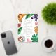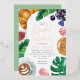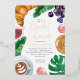 Invite guests for an elegant summer bridal shower brunch with these beautiful watercolor invitations. Design features your celebration details in modern lettering with gold foil accents, surrounded by illustrations of breakfast pastries, croissants, macarons, coffee, and lush tropical greenery with banana leaves and a monstera leaf.