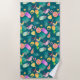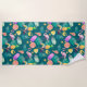 Fun tropical images make a colourful pattern on this cute beach towel. Images include a toucan bird, a pink flamingo, an ice cream cone, ice cream bars, a bright grapefruit slice, and a lemon, all surrounded by bold stars and green palm leaves. The multi coloured, bright images are placed on a dark teal background, and repeated across the surface of the towel. Bright, colourful and fun, no matter where you spend the summer!