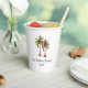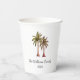 Tropical summer swim party paper cups, with a palm trees illustration design and customizable lettering. A great addition your pool party with a beach picnic theme.