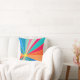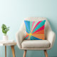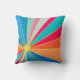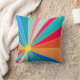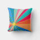 This throw pillow has a design of a tropical sunrise in reds, oranges, blues, and greens.