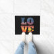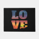 A tropical beach is the perfect setting for love! Beautiful knockout text effect door mat with stacked letters of the word LOVE. Great to keep sand from being tracked in at your beach house. A colourful tropical sunset scene with palm trees in silhouette shows through the block letters on black background.