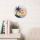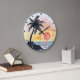 This artistic wall clock showcases a serene tropical scene with a graceful palm tree silhouetted against a vibrant sunset over the ocean. Its decorative and colourful design, with a relaxing vibe, makes it ideal home décor. This nature-inspired timepiece captures a tranquil beach view, bringing a touch of summer vibes and coastal theme to any room.