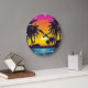 This round wall clock features a breathtaking tropical sunset scene. Silhouetted palm trees frame a vibrant sky ablaze with fiery oranges, yellows, and deep pinks, casting a warm glow over tranquil blue waters. The clock has clear white numerals and black hands, making it a functional art piece. It's perfect for adding a serene, vacation-like ambiance to any room.