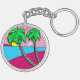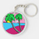 A vibrant, cartoon-style circular emblem capturing a dreamy tropical scene: two lush green palm trees frame a serene ocean with a sailboat gliding under a pink sunset sky. The bold color blocks and playful aesthetic make it perfect for beach-themed apparel, travel logos, or summer party decor. tropical design, palm trees, sailboat, sunset art, beach theme, circular emblem, vector illustration, vacation vibes, summer decor, nautical logo