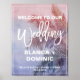 This tropical sunset wedding welcome poster is perfect for a destination or beach wedding. The design features a stunning pink, purple and blue watercolor sunset complete with a palm tree blowing in the breeze. Customize the poster with the name of the bride and groom, and the date and location of the wedding.