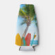 This design features colourful surfboards standing up in the sand with a palm tree, beach and ocean in the background.