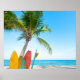 This design features colourful surfboards standing up in the sand with a palm tree, beach and ocean in the background.