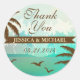 Tropical Teal Scenic Beach Thank You Sticker. A great thank you sticker for all your mailing or packaging needs. Place on your envelopes as seals or package a gift up really cute and use these to show your thanks! Features a turquoise blue ocean with waves. Palm trees are in the foreground and also the background making this a great scenic thank you sticker. Greeting on front. Matches our coordinating wedding stationery line for you wedding!