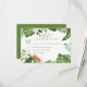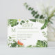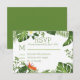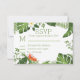 Trendy, modern tropical RSVP wedding cards- Botanical Hawaiian summer theme wedding. Bordered with botanical, tropical palm leaves and bird of paradise and ivory plumeria (frangipani) flowers. Back has matching solid green background, which may be changed to any colour. Use the Customize It button to change anything - font styles, sizes, colours, or placement. We have coordinating, tropical floral wedding supplies and decor in our Zazzle.com/angela65* shop. Perfect for summer weddings, Hawaii destination wedding, botanical themes, and tropical floral themes.