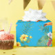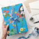 Tropical pattern with toucans, hibiscus, heliconia, and anthurium on a bright blue.