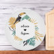 Elegant cutting board with a tropical frame with leaves and abstract toucan bird. This can be customized with a couple's names. The names are in a black script font. The background is white. The colour of the heart is editable by going into the design tool, selecting the heart layer on the left, and then clicking on the colour box on the right to bring down a colour chart.