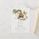 This wedding save the date postcard is a tropical jungle design with the colors of nature. It features palm trees, luscious rainforests, and bungalows nestled within a beautiful tropical paradise setting.