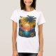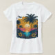 Capture the magic of a tropical evening with this vibrant t-shirt featuring a stunning sunset, silhouetted palm trees, and playful bats.