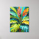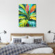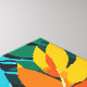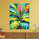 This design captures the lush beauty of tropical foliage in a bold, stylized manner. The composition features a striking arrangement of diverse plant leaves, including broad monstera leaves, slender palm fronds, and vivid heliconia. The colour palette is rich and eye-catching, with shades of green ranging from lime to emerald, accented by bright oranges, yellows, and pinks.