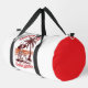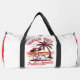 This white duffle bag features a humourous graphic of a skeleton relaxing under a palm tree on a beach at sunset, wearing a hat, with the text "TROPICAL VIBES" above and "Endless Summer" below. This quirky design is perfect for those who love summer, the beach, and a bit of dark humour. Edit colour of the bag caps and body in the Design tool to your favored colours.