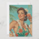 A glamourous woman in a floral dress and Hawaiian lei enjoys a cocktail under palm trees, radiating retro island charm and vacation bliss.