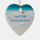 Heart-shaped, Christmas tree keepsake ornament for the newlywed couple. Names and wedding date go on the front, with any text on the back. Tropical ocean water and beach sand is the background image.