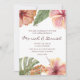 Lovely watercolor painted hibiscus flowers and green palms grace this invitation design.