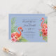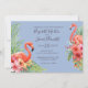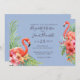 Tropical, delicate watercolor flamingos in pink and orange hibiscus flowers with tropical foliage. Blue background colour can be change to match your wedding colours.