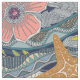 Tropical hibiscus flowers, starfish and waves pattern, originally drawn in ink. Available in earth, iron, mulberry and navy.