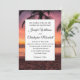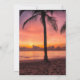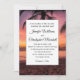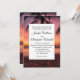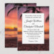 Beach themed customizable wedding invitation features black text on a white background. The text overlays an ocean scene pink and orange hues and a tall palm tree on a beach.