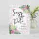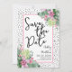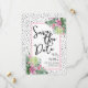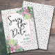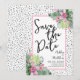 Un design tropical qui embrasse la beauté tranquille de la nature mélangée à une touche ludique qui vous aidera à vous amuser. Un mélange de feuilles tropicales vertes apaisantes, y compris des feuilles de bananier, des palmiers, des feuilles de monstera et des plantes princesse rose, ainsi que des fleurs d'orchidées violet-rose apaisantes et des fleurs de protea, entrelacées avec divers autres feuillages. Ajoutant un élément de plaisir, un fond noir «pointillé désordonné» ou «pointillé dalmatien» infuse le design d'une touche ludique. Amélioré par une police manuscrite moderne, cette impression enchanteresse rayonne de charme et de sophistication. Ce design polyvalent apporte une sensation de paradis tropical à n'importe quel cadre ou occasion spéciale, ce qui le rend parfait pour un mariage à destination, ou simplement lorsque vous voulez ajouter une touche tropicale. Fleurs Colorées Palmier Aquarelle Tropical Mariage Économisez la Date