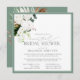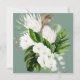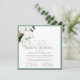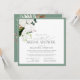 Modern, elegant square virtual bridal shower invitation featuring a bouquet of white orchids and proteas, and tropical botanical greenery, bordered in pale eucalyptus green. Personalize your bridal shower details in soft off-black, accented with beautiful modern hand lettered calligraphy. The back of the card features a matching lush tropical bouquet over a matching pale green texture. Copyright Elegant Invites, all rights reserved.