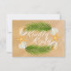 The design features a tropical wreath of palm leaves, seashells & starfish on a sandy background with color coordinated wording.