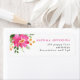 Un label d'adresse de retour lumineux, coloré et moderne, avec un grand bouquet de fleurs d'aquarelle audacieux en rose, orange et vert tropicaux. Ton nom est rose fushia, et ton adresse en noir.