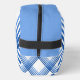 Blue lines in varying five shades Dark to light, bottom to top. Two Sets of stripes are placed diagonally, meeting at the center of top and bottom of bag on each side. These two sets are then replicated and flipped, so that they cross. Top panel is lightest shade of blue.