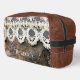 Magnifiquement rustique, grand sac de toilette de style occidental, alias Dopp Kit, a un arrière - plan en cuir à outils foncé et un panneau en dentelle faux antique avec une rangée de perles appliquées. Personnalisez-le avec le modèle facile à utiliser fourni. La police est entièrement personnalisable si vous voulez utiliser une autre face de type de style.