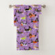 Cute Basset Hound dogs with brown, black, white and lemon coats wear witch hats and Halloween costumes with scattered bats, paws and dog bones.