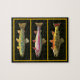 Design features three beautiful trout - the Brook Trout, salvelinus fontinalis; the Rainbow Trout, oncorhynchus; and, the Brown Trout, salmo trutta. The art is taken from three original watercolor paintings by Doug Shultz. Makes a unique gift for anyone who loves fishing or ichthyology. This same design is available on lots of other items at the Trout Whiskers Store. Puzzles are available with other kinds of fish, too.