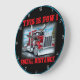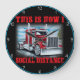 This humourous wall clock makes a timely and witty statement about a truck driver's lifestyle. Against a black background with a striking blue rim, it features a red semi-truck on a road, with clouds and trees in the background. The bold red text reads: "THIS IS HOW I SOCIAL DISTANCE", highlighting the inherent isolation of long-haul trucking. This is a perfect piece for a truck driver who appreciates a good laugh and recognizes the unique aspects of their profession. You can customize the colour of the frame to any colour you desire by going into the design tool.