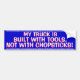 BLUE BUMPER STICKER WITH RED AND WHITE WRITING. THE CAPTION SAYS: MY TRUCK IS BUILT WITH TOOLS,NOT WITH CHOPSTICKS! TOP AND BOTTOM BOARDERS HAVE "BUILT IN THE USA" REPEATED IN SMALL WHITE LETTERING.